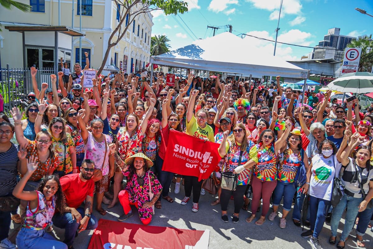 Professores e funcionários da educação de Fortaleza realizaram uma manifestação em frente ao Paço Municipal nesta sexta-feira, 27. A categoria está paralisada desde a assembleia geral realizada na manhã dessa quinta, 26. Liderados pelo Sindicato Único dos Trabalhadores em Educação do Ceará (Sindiute), os profissionais decidiram que só iniciam o ano letivo quando o prefeito José Sarto anunciar o reajuste do piso salarial do magistério. Hoje, toda a rede de educação básica do município ficou sem aulas.