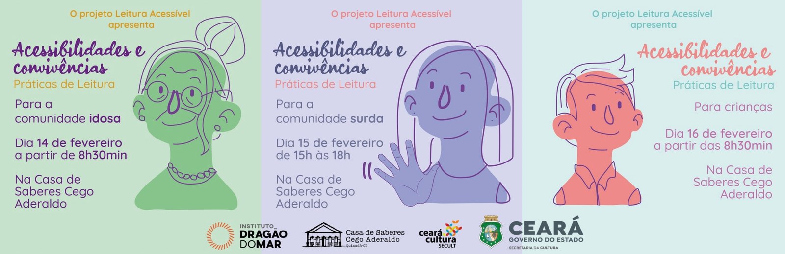Entre os dias 14 a 16 de fevereiro, acontece o projeto “Práticas de Leitura: Acessibilidades e Convivências”, uma realização da Casa de Saberes Cego Aderaldo, equipamento da Secretaria da Cultura do Estado do Ceará (Secult Cear)a, gerido em parceria com o Instituto Dragão do Mar, através do produto final da educadora Lorena Patrício, que visa promover experiências de leitura através de mediações de textos literários, incluindo e possibilitando acessibilidades em espaços culturais.