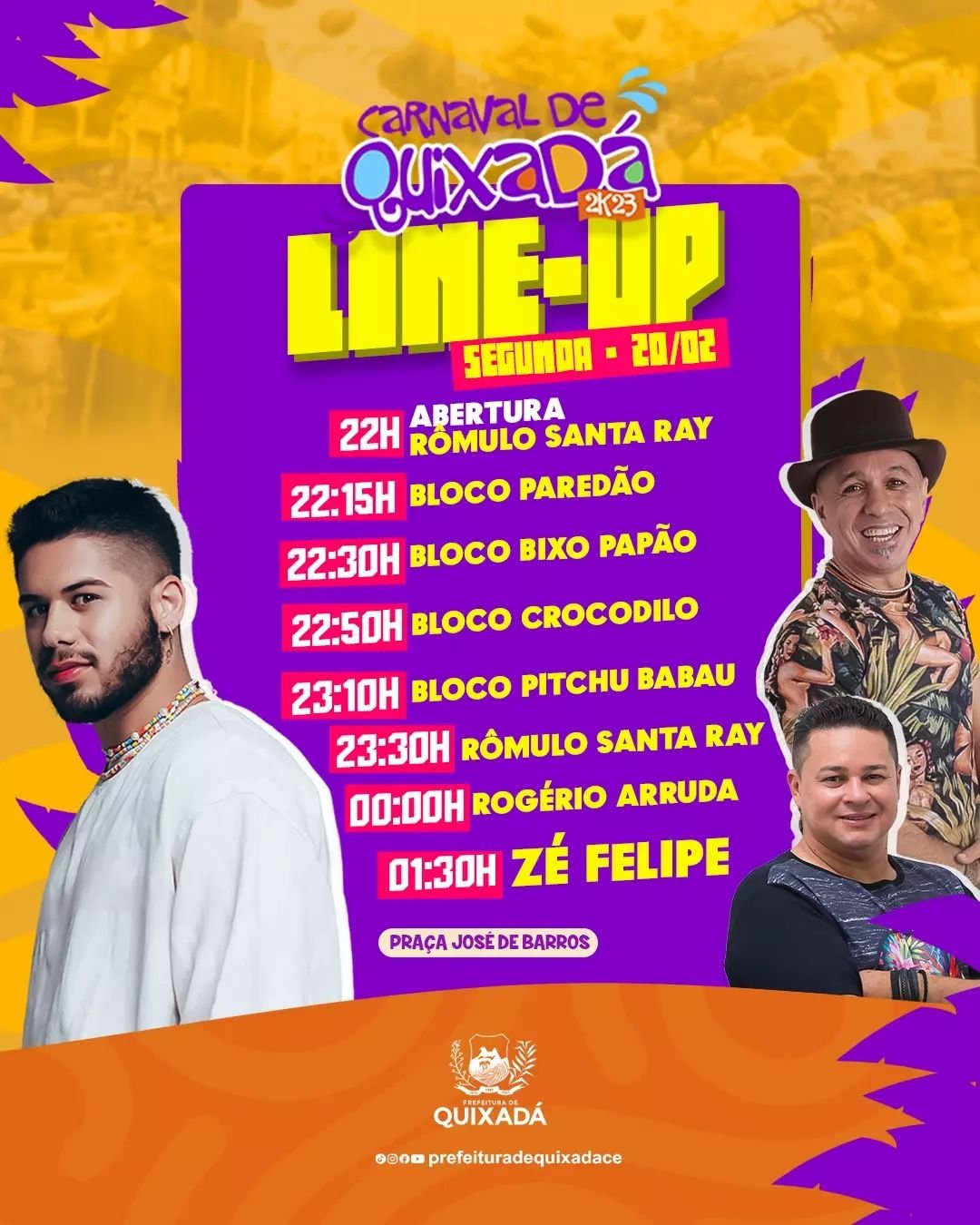 Em Banabuiú, Zé Cantor cantará a partir das 17h, sendo a segunda atração do dia na cidade. Em Quixeramobim, o artista também deverá ser o segundo a se apresentar, por volta das 23h30. Zé Felipe cantará a partir de 1h30 em Quixadá, segundo a gestão local.