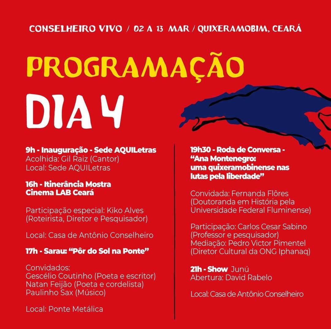 O final de semana de programação da 19ª Edição do Conselheiro Vivo está super animada. Tudo gratuito e aberto a todos os públicos. O evento, que acontece em Quixeramobim, a 214 quilômetros de Fortaleza, teve início na última quinta-feira, 2, e segue até o dia 13 de março, data de aniversário de Antônio Conselheiro, em Quixeramobim. Desde 2019, o Conselheiro Vivo foi incluído no Calendário Oficial de eventos do Estado do Ceará. O tema do Conselheiro Vivo deste ano é “Democracia e civilização: vida digna ao povo do Sertão”.