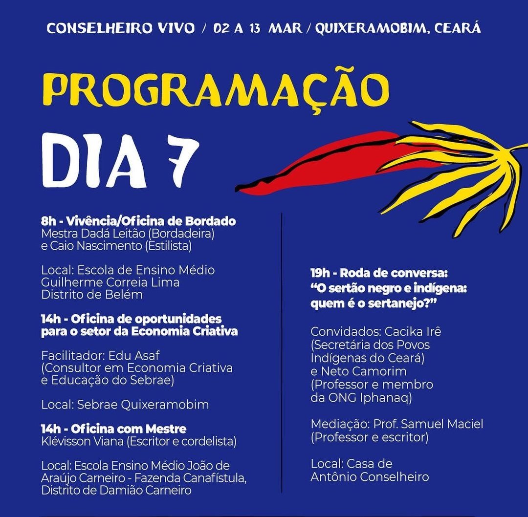 A terça-feira de evento será encerrada às 19h, na Casa de Antônio Conselheiro, com a roda de conversa “O sertão negro e indígena: quem é o sertanejo?”. Na ocasião, participarão a secretária dos Povos Indígenas do Ceará, Cacika Irê, e o professor e membro da ONG Iphanaq Neto Camorim. A mediação será por conta do professor e escritor Samuel Maciel.