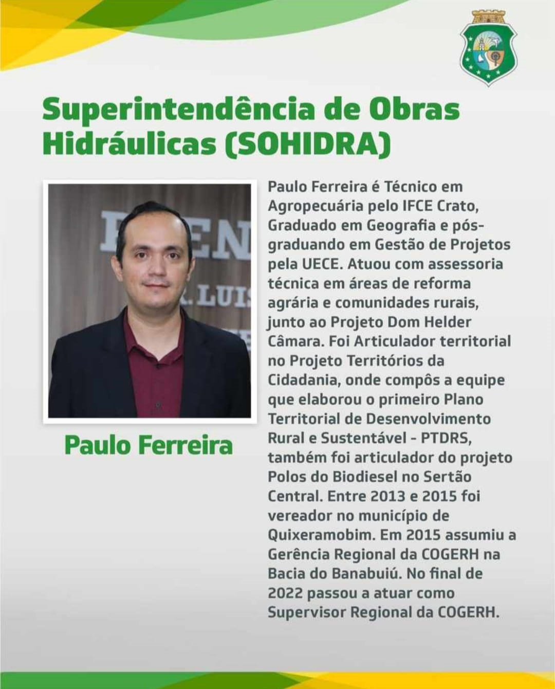 A Superintendência de Obras Hidráulicas, a Sohidra, será comandada pelo quixeramobinense Paulo Ferreira. Atualmente, Paulo atuava como supervisor das Gerências Regionais da Companhia de Gestão dos Recursos Hídricos (Cogerh). A nomeação feita pelo governador Elmano de Freitas (PT) foi publicada nesta quinta-feira, 09, no Diário Oficial do Estado (DOE).