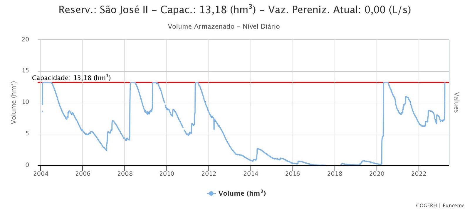 O açude São José II, localizado em Piquet Carneiro, é o quarto reservatório monitorado da bacia do Banabuiú a atingir capacidade máxima e sangrar em 2023, de acordo com a Companhia de Gestão dos Recursos Hídricos (Cogerh).