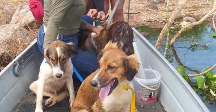 Usando uma lancha com uma guia da região, os bombeiros realizaram uma busca pelo local e, após a navegação de quatro milhas náuticas, encontraram dois cachorros. Usando uma contenção, os militares colocaram os animais na embarcação.