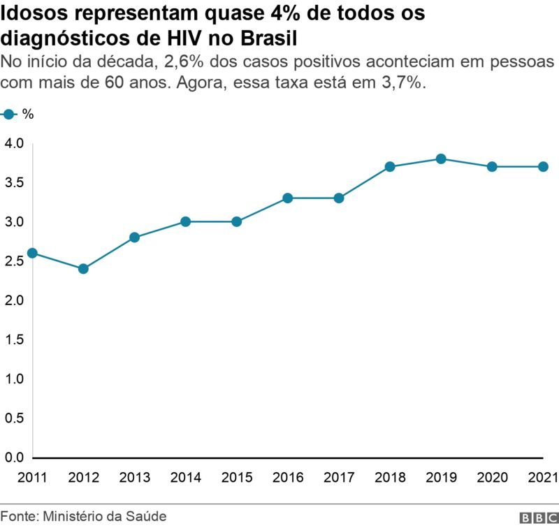Para se ter ideia, 360 brasileiros com mais de 60 anos testaram positivo para o HIV em 2011. Essa taxa subiu ano após ano e chegou a 1.738 em 2019.