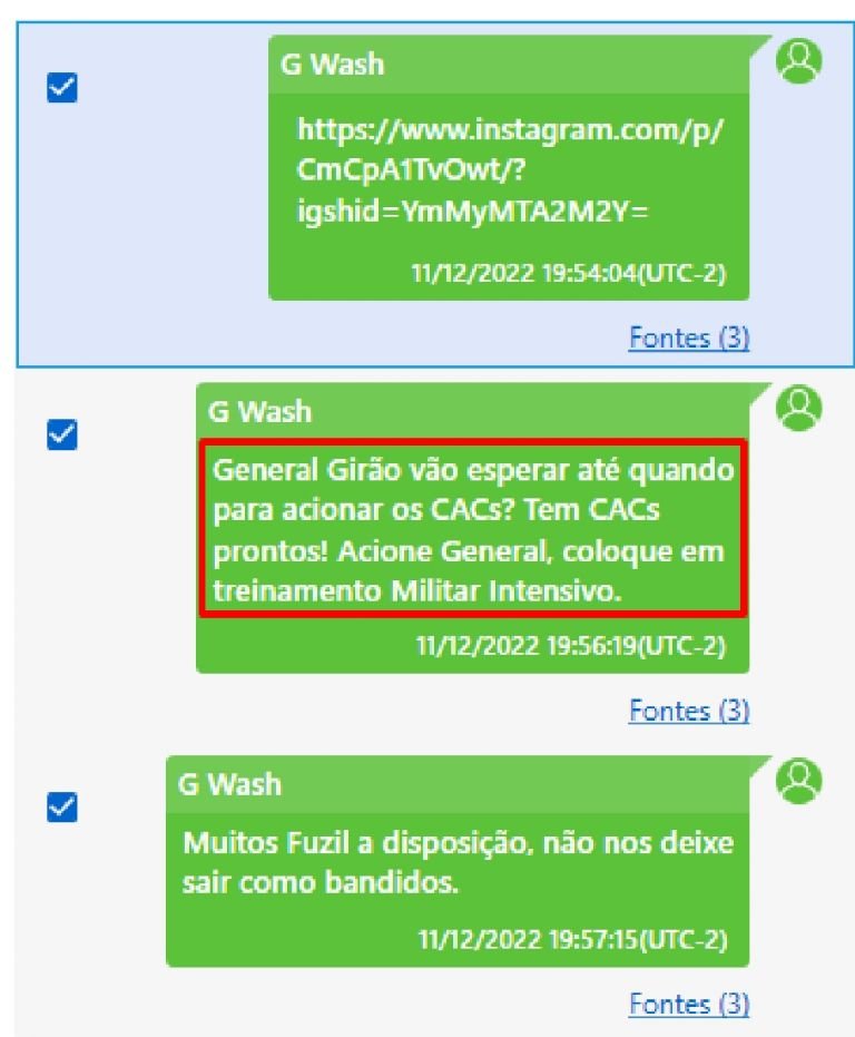 “General Girão, vão esperar até quando para acionar os CACs? Têm CACs prontos. Acione, general! Coloque-os em treinamento militar intensivo. Temos muitos fuzis a disposição, não nos deixe sair como bandidos”, escreveu George Washington em 11 de dezembro de 2022 para Eliéser Girão. No dia seguinte foi registrado a primeira arruaça em Brasília, quando golpistas incendiaram a capital contra a diplomação do presidente Lula (PT).