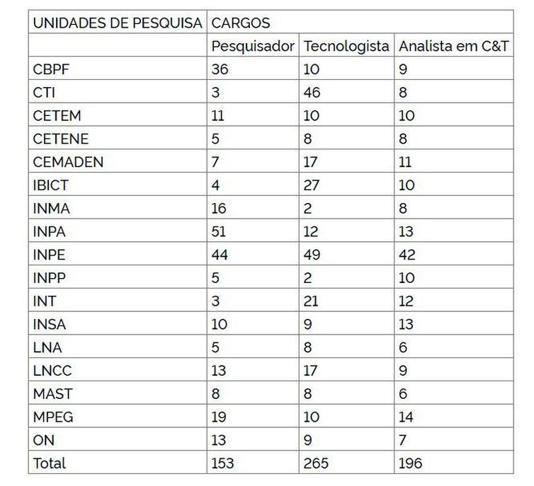 Os 714 cargos das unidades de pesquisa serão distribuídos entre o Centro Brasileiro de Pesquisas Físicas (CBPF), o Centro de Tecnologia da Informação Renato Archer (CTI), Centro de Tecnologia Mineral (CETEM), o Centro de Tecnologias Estratégicas do Nordeste (CETENE), o Centro Nacional de Monitoramento e Alertas de Desastres Naturais (CEMADEN), o Instituto Brasileiro de Informação em Ciência e Tecnologia (IBICT), o Instituto Nacional da Mata Atlântica (INMA), o Instituto Nacional de Pesquisas da Amazônia (INPA), o Instituto Nacional de Pesquisas Espaciais (INPE), o Instituto Nacional de Pesquisas do Pantanal (INPP), o Instituto Nacional de Tecnologia (INT), o Instituto Nacional do Semiárido (INSA), o Laboratório Nacional de Astrofísica (LNA), o Laboratório Nacional de Computação Científica (LNCC), o Museu de Astronomia e Ciências Afins (MAST), o Museu Paraense Emílio Goeldi (MPEG) e o Observatório Nacional (ON).