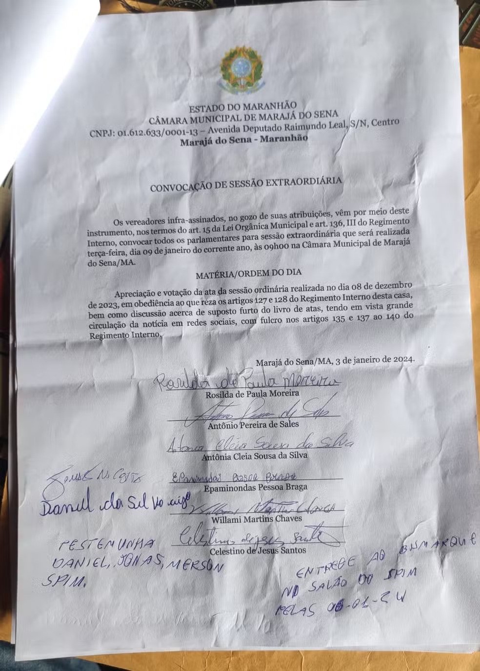 “Foi entregue ao presidente, ele não recebeu, mas foi entregue. Foi entregue aos demais vereadores, enfim, quando a gente chegou a Câmara tava fechada, então nós não tínhamos outra alternativa a não ser serrar o cadeado para fazer a sessão e votar a ata do dia 8. Essa ata desapareceu desde o 22 e a gente está querendo assinar”, disse o vereador.