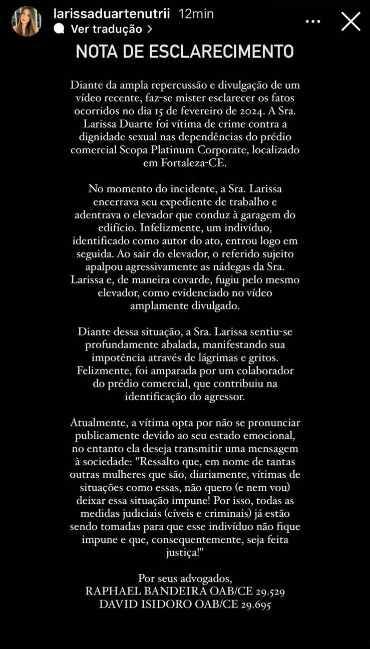 Nesta segunda-feira, 18, a empresa de investimento em que trabalha o homem flagrado passando a mão em partes íntimas de uma mulher dentro de um elevador em Fortaleza anunciou o afastamento em definitivo do colaborador.