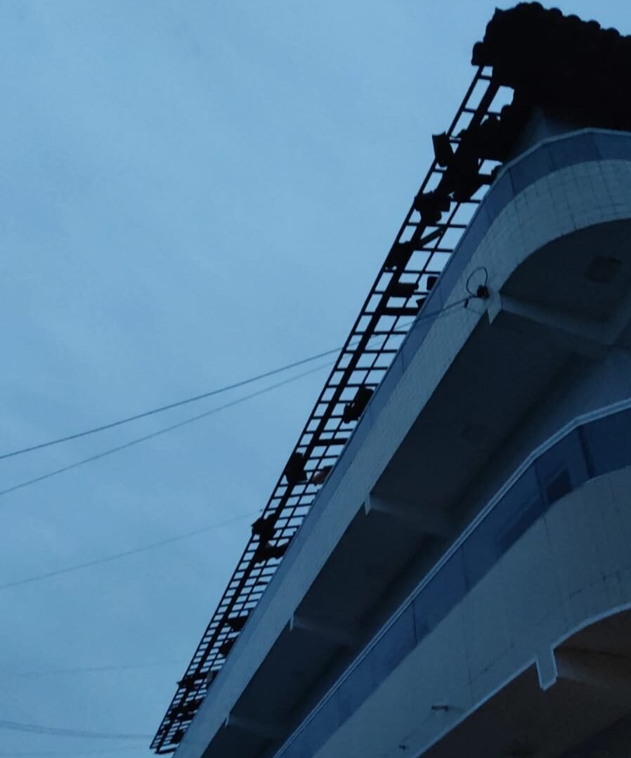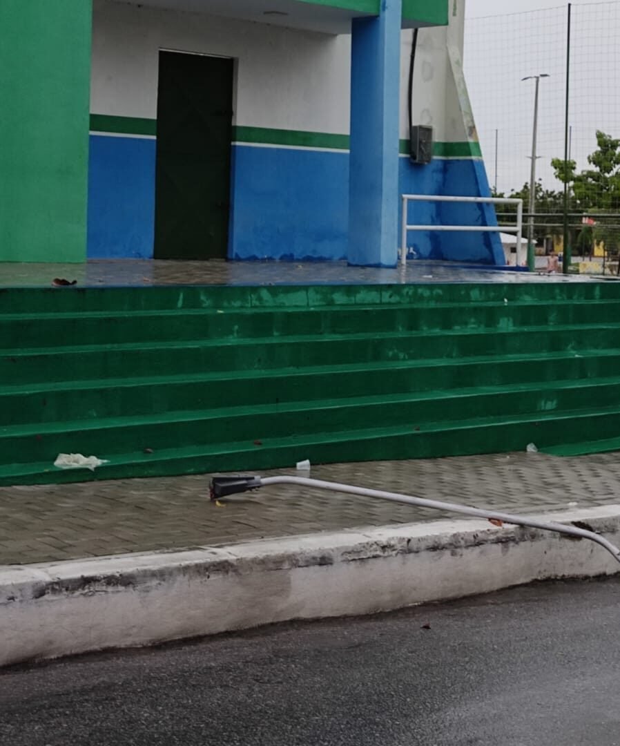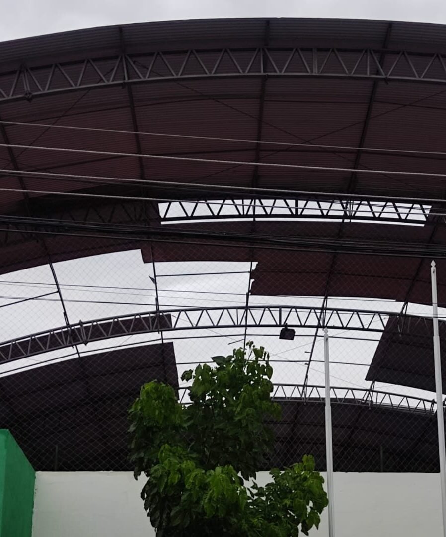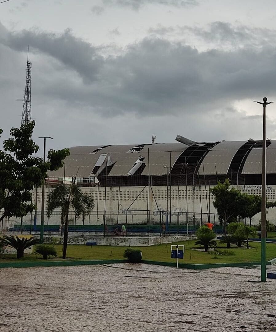 Em imagens, é possível ver parte da cobertura do ginásio arrancada