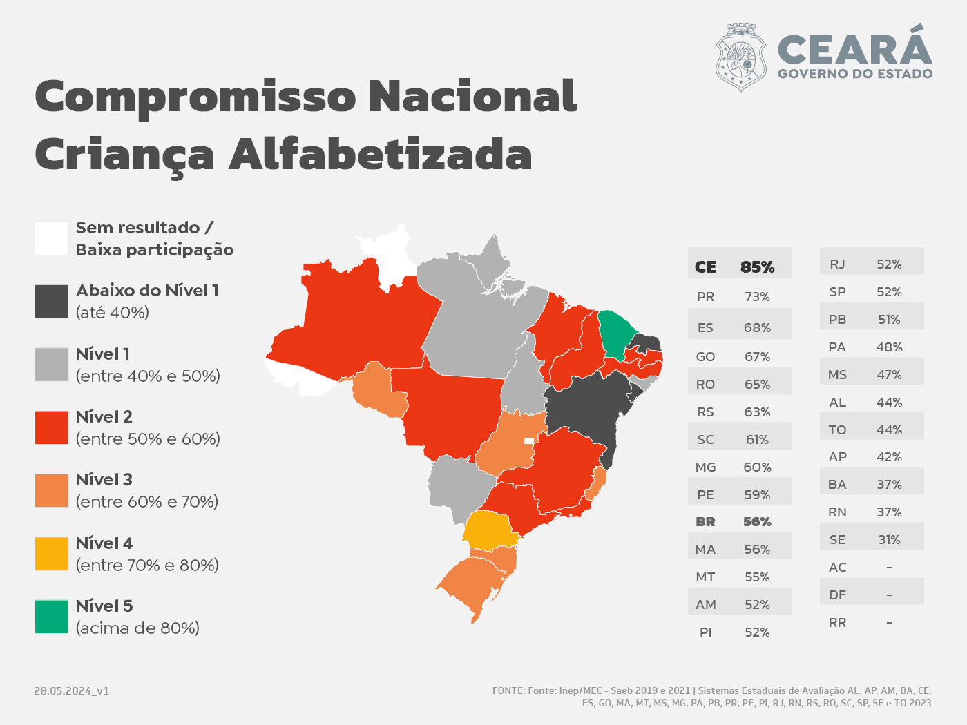 O Ceará é o único estado brasileiro a ter mais de 80% das crianças alfabetizadas na idade certa, ou seja, sabendo ler e escrever ao final do 2º ano do ensino fundamental. É o que aponta o primeiro relatório do novo indicador apresentado pelo Ministério da Educação, nesta terça-feira, 28, durante reunião do Compromisso Nacional Criança Alfabetizada, em Brasília. O momento contou com as presenças do presidente Lula, do ministro Camilo Santana, e de governadores, incluindo o governador Elmano de Freitas.