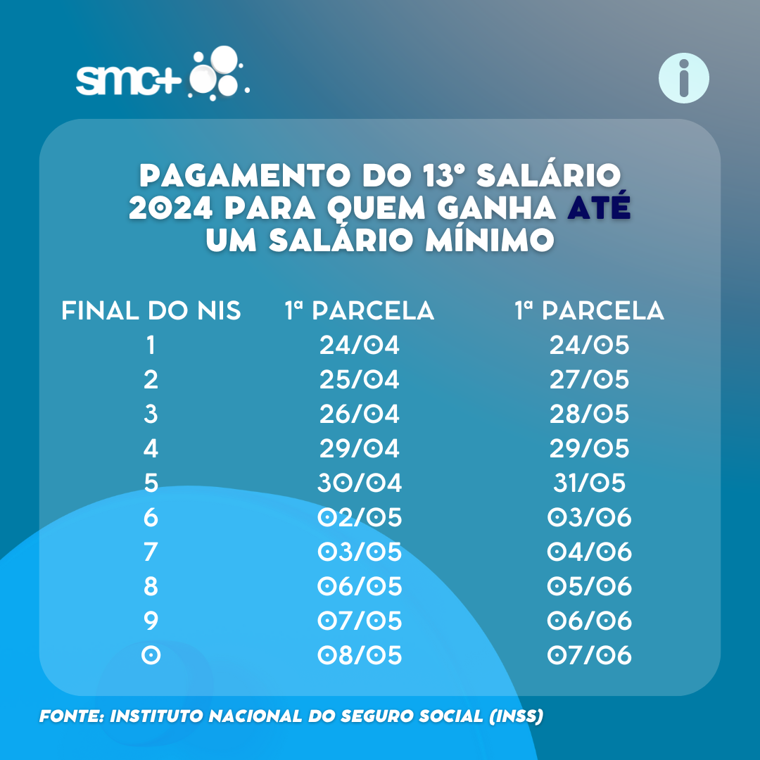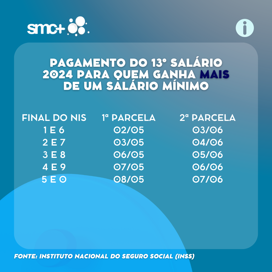 A partir desta segunda-feira, 3, os aposentados e pensionistas do Instituto Nacional do Seguro Social (INSS) que ganham mais que um salário mínimo começam a receber a segunda parcela do décimo terceiro salário. As datas de pagamento seguem até dia 7 de junho e são definidas conforme o dígito final do Número de Inscrição Social (NIS).