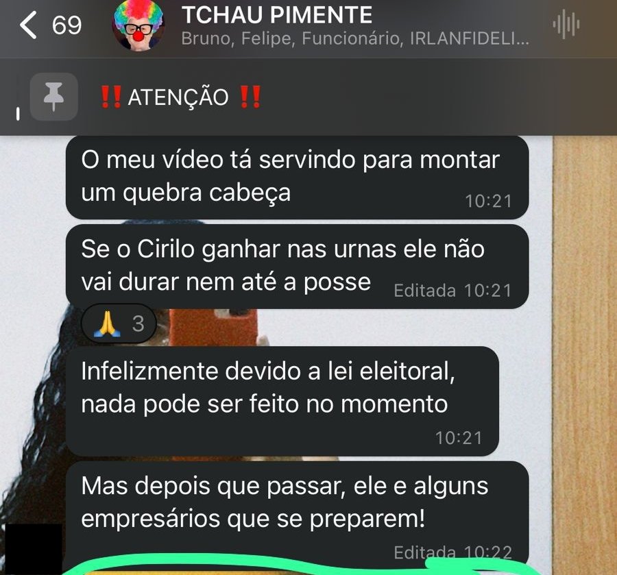 A outra mensagem foi enviada em um grupo de WhatsApp que o suspeito administra: “Se o Cirilo ganhar nas urnas, ele não vai durar nem até a posse”.