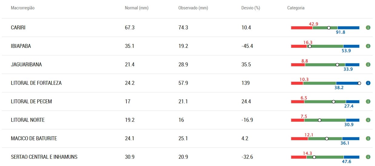 A região do Cariri teve os melhores números de precipitações, com acumulado de 74,3 mm. No entanto, o Litoral de Fortaleza foi a única macrorregião a registrar chuvas acima da média em dezembro, com 57,9 mm, um desvio positivo de 139%.