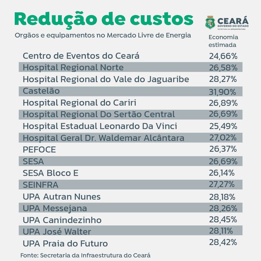 Iniciada em novembro de 2024, com a inclusão do Centro de Eventos do Ceará e a sede da Perícia Forense (Pefoce), a migração representa, somente no caso da Arena Castelão, uma economia de 31,9% dos gastos atuais com energia. Equipamentos de alto consumo, os Hospitais Regionais do Cariri (-26,89%), da Região Norte (-26,58%), do Sertão Central (-26,69%) e do Vale do Jaguaribe (-28,27%) também terão reduções significativas em suas despesas. No caso do Hospital Estadual Leonardo da Vinci e do Hospital Geral Dr. Waldemar Alcântara, a economia estimada será, respectivamente, de 25,49% e de 27,02%.
