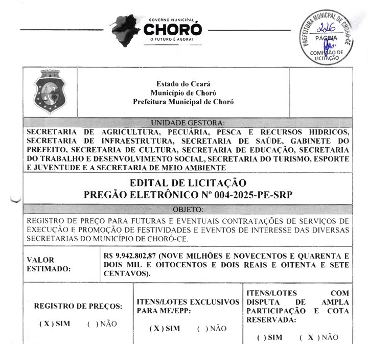A Prefeitura de Choró, no Sertão Central, publicou um aviso de licitação para eventuais e futuras contratações de serviços de execução e promoção de festividades e eventos no último dia 5 de fevereiro. Cinco dias depois, na última segunda-feira, 10, a gestão municipal revogou o processo.