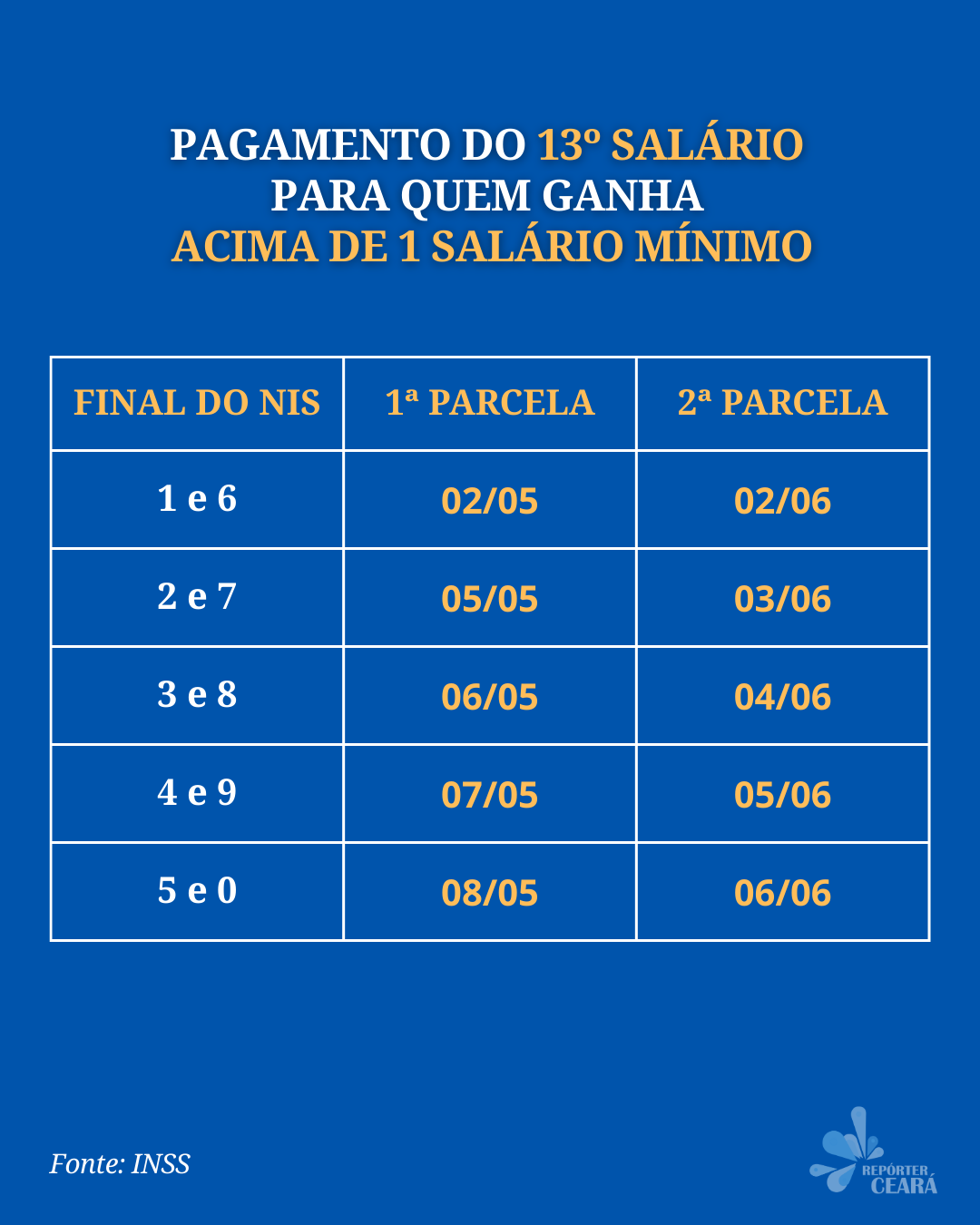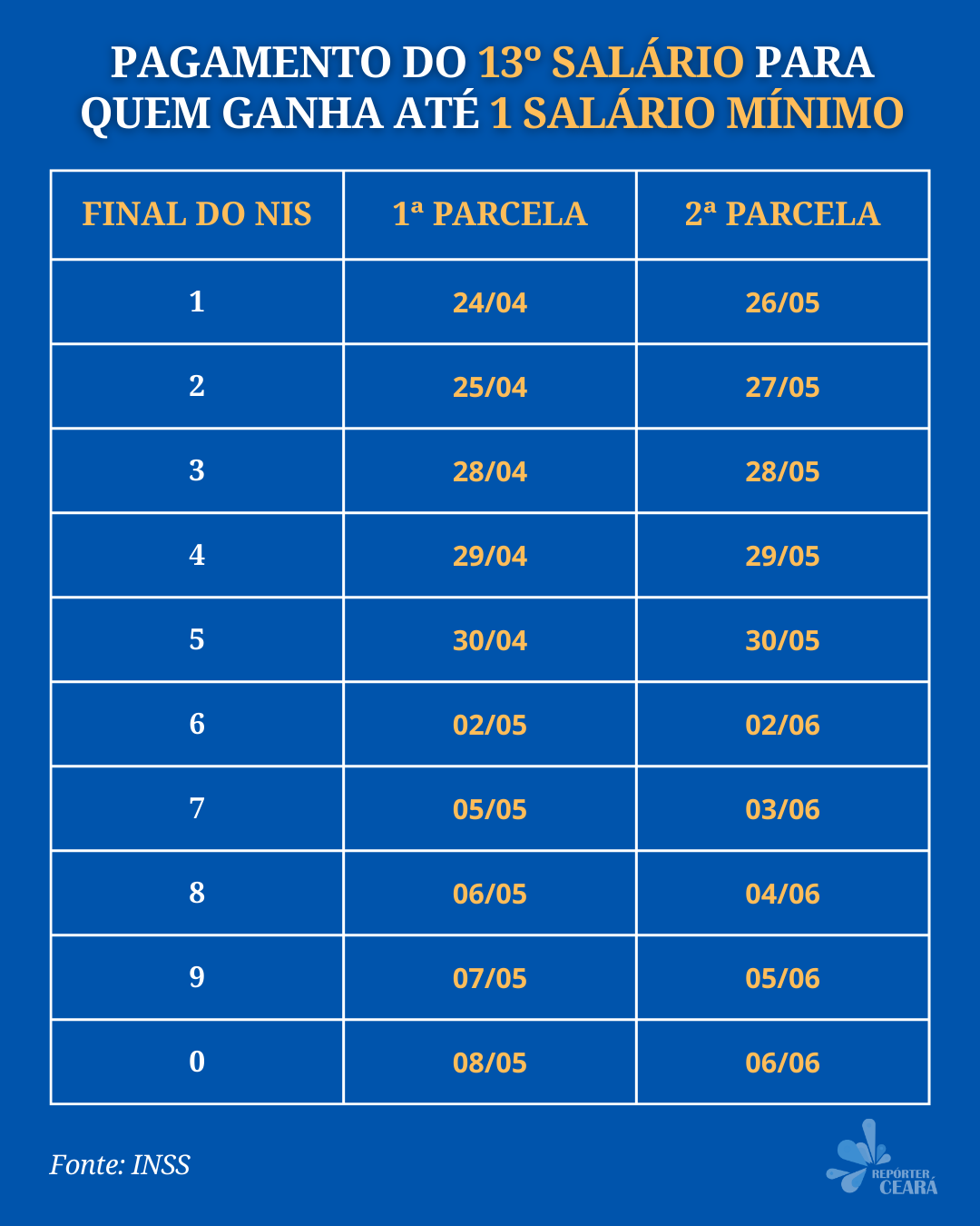 O pagamento de 50% da gratificação natalina virá junto com o benefício do mês corrente, que será pago de 24 de abril a 8 de maio. A segunda parcela sairá junto com o calendário de maio, que vai de 26 de maio a 6 de junho.