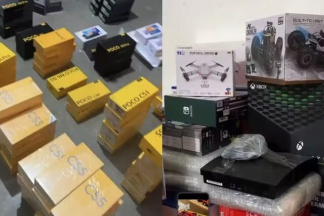 Entre os produtos disponíveis estão iPhones, celulares de diferentes marcas, caixas de som, fones de ouvido bluetooth, perfumes importados, brinquedos, eletroeletrônicos, malas de viagem, roupas e diversos outros artigos novos.