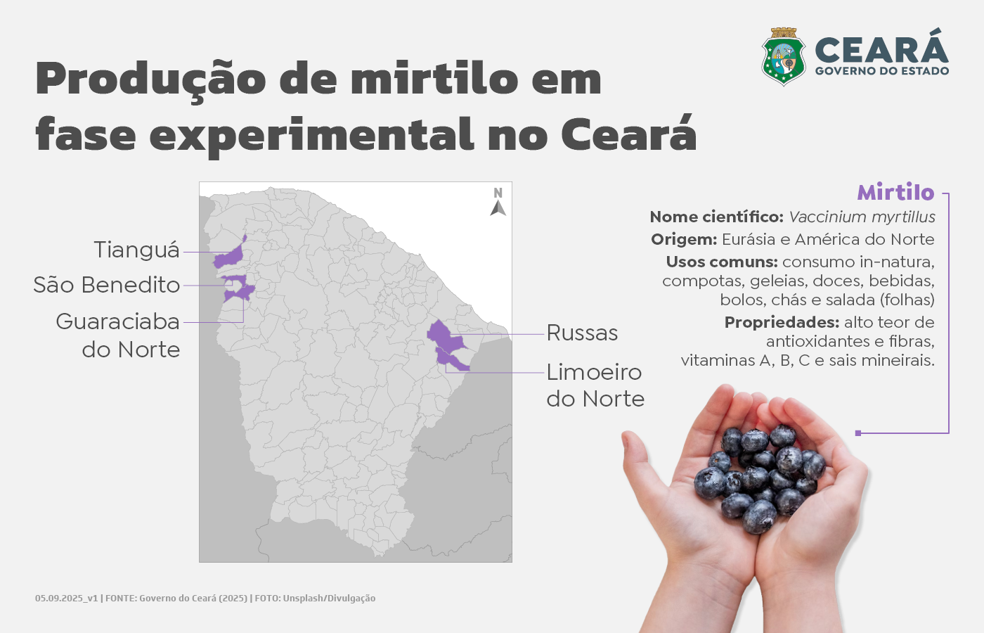 Sob a luz do sol que brilha quase todos os dias, o Ceará desponta como um território promissor para o cultivo do mirtilo (também conhecido como blueberry). Essa perspectiva, que vem animando o setor público e produtores locais, decorre de uma combinação de fatores capazes de colocar o estado no mapa global da produção, ainda incipiente no Brasil. Com sua abundância de luminosidade natural, aliada à localização estratégica no Atlântico, o estado reúne condições ideais para favorecer também a exportação direta para mercados altamente consumidores, como Europa, Estados Unidos e Ásia.