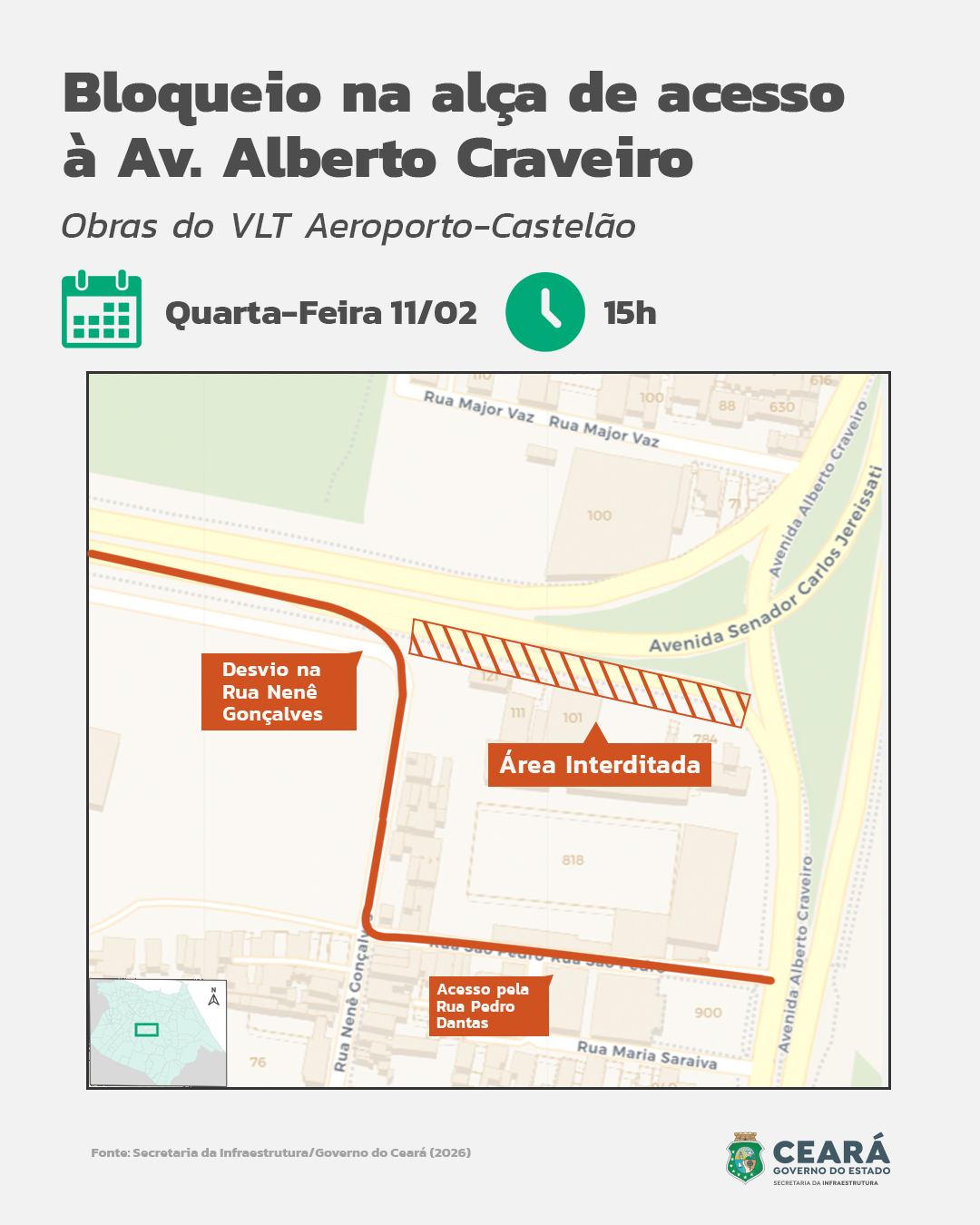 As obras da nova linha VLT Aeroporto–Castelão, executadas pela Secretaria da Infraestrutura do Ceará (Seinfra), seguem avançando em Fortaleza e entram, a partir desta quarta-feira, 11, às 15h, em uma nova etapa que exige uma intervenção viária na região. A interdição ocorrerá com o bloqueio total na alça de acesso da Av. Carlos Jereissati (Av. do Aeroporto) para a Av. Alberto Craveiro, no sentido BR-116.