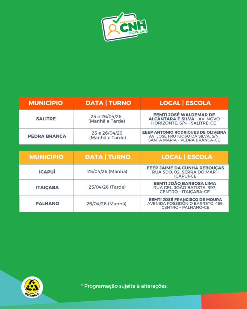 O Departamento Estadual de Trânsito do Ceará (Detran-CE) realizará, nestes sábado e domingo, 25 e 26 de abril, o atendimento aos selecionados com inscrições aprovadas no programa CNH Popular (edição 2025) dos municípios de Icapuí, Itaiçaba, Palhano, Pedra Branca e Salitre.