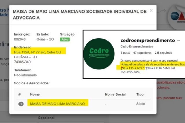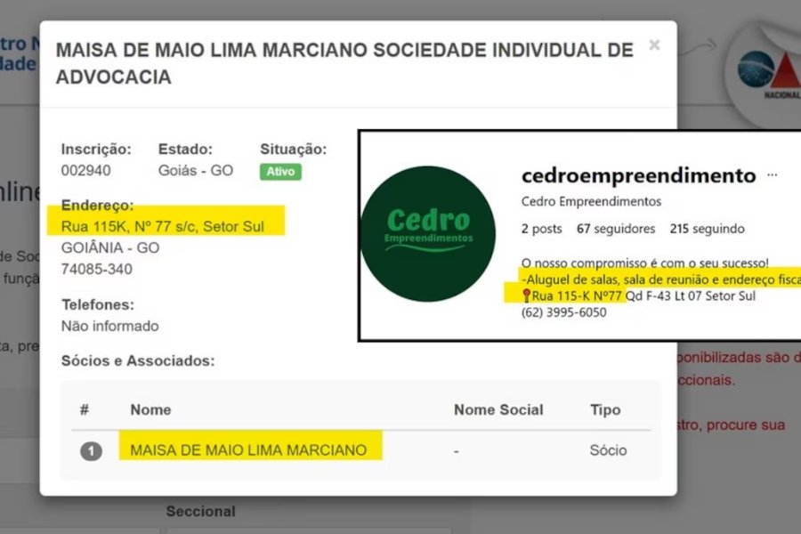 O escritório da advogada Maísa de Maio Marciano tem endereço, conforme registrado no cadastro nacional da Ordem dos Advogados do Brasil (OAB), em uma sala compartilhada do bairro Setor Sul da capital goiana. Na internet, o espaço diz oferecer serviços de aluguel de salas, sala de reunião e endereço fiscal.